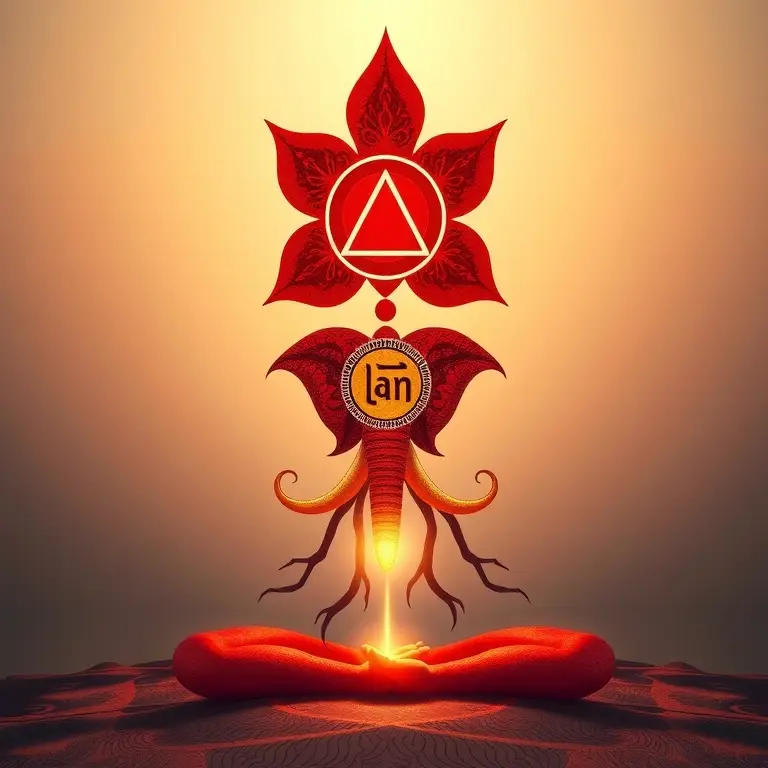 The traditional bija mantra is “LAM,” often chanted on a long exhale while feeling vibration in the pelvic floor and tailbone.